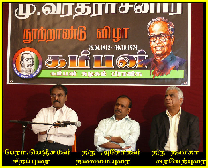 கம்பன் கழகத்தின் பொருளாளர் திருமிகு தணிகா சமரசம் அனைவரையும் வரவேற்றார் ; கழகத்தின் துணைத் தலைவர் திருமிகு கி அசோகன் விழாவுக்குத் தலைமை தாங்கி முனைவர் மு.வ பற்றி நல்லதோர் உரை ஆற்றினார். கம்பன் இலக்கண இலக்கியத் திங்கள் இதழ் சார்பாக ‘மு;வ நூற்றாண்டு விழா’ மலர், ‘அன்னை தெரெசா மலர்’, ‘கவிஞர் தமிழ்ஒளி மலர்’ ஆகிய மூன்று மலர்களை வெளியிட்டவர் திருமிகு அ. நாகராசன். இவர் பல்லாண்டுகளாகத் தனி ஒருவராக உழைத்துப் பிரஞ்சு-தமிழ் அகராதி உருவாக்கியவர். கழகத்தின் இளங்கவிஞர் திருமதி அருணா செல்வம் எழுதிய ‘நினைக்க நினைக்க இனிக்கும் தமிழ்’ என்னும் கவிதை நூல் வெளியிடப்பட்டது. வெளியிட்டவர் கவிமணி விசயரத்தினம்.