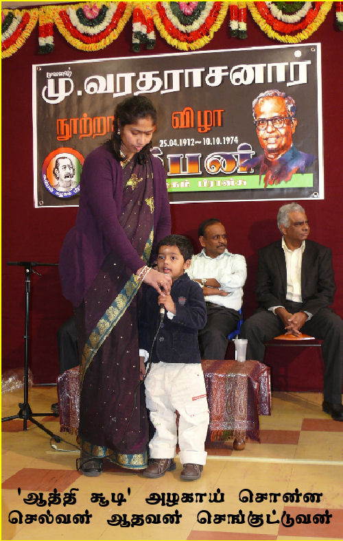 இந்த நிகழ்ச்சி முடிந்ததும் மேடை ஏறினார் மூன்று வயது செல்வன் யுவராசன் என்னும் ஆதவன் செங்குட்டுவன். ஔவையாரின் ஆத்திசூடியை ஒரு வரி பிசகாமல் ஒன்றல்ல இரண்டல்ல 108 வரிகளையும் தன் மழலை மொழியில் தடங்கல் இல்லாமல் உரைக்கக் கேட்ட அவையோர் அசந்து போயினர். ஒளவையின் படைப்பை அந்த ஔவை வணங்கும் முருகப் பெருமானே வந்து ‘உபதேசம்’ செய்தது போலவே இருந்தது.