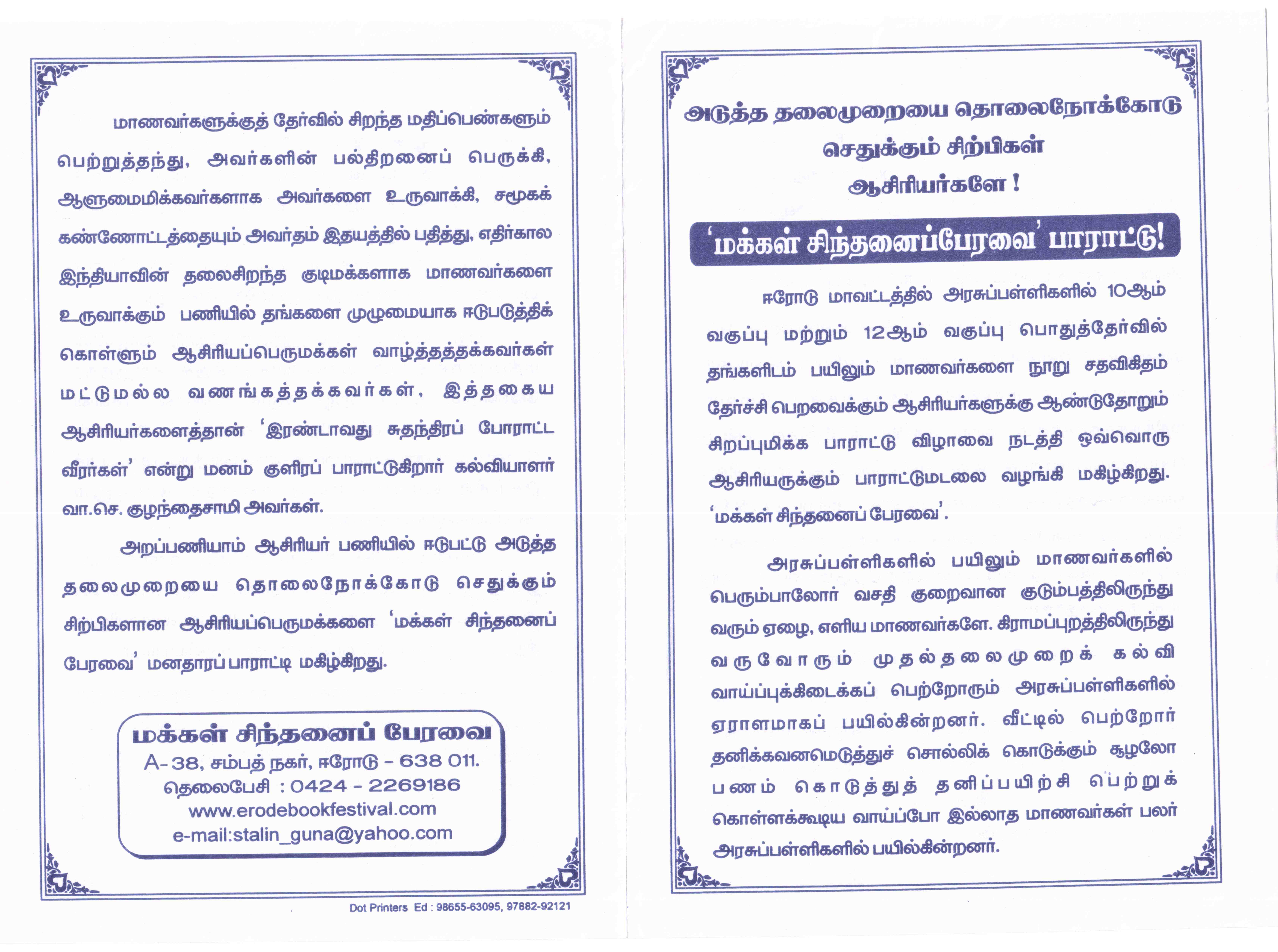 செய்திகள் ஈரோடு-மக்கள் சிந்தனைப் பேரவையின் ஆசிரியர் தின அழைப்பிதழ்! செய்தியாளர்-1 July 20, 2012 0 ஸ்டாலின் குணசேகரன் பதிவாசிரியரைப் பற்றி செய்தியாளர்-1 வல்லமை செய்தியாளர்-1 See author's posts Post navigation Previous: இயற்கையின் எழிலில் இறைவனைக் காண்போம்(1)Next: புதுச்சேரியில் தமிழ்க் கணினி வல்லுநர் ஆண்டோ பீட்டர் நினைவஞ்சலிக் கூட்டம் More Stories கட்டுரைகள் செய்திகள் இங்கிலாந்திலிருந்து ஒரு மடல் … 313 சக்தி சக்திதாசன் February 18, 2026 0 கட்டுரைகள் செய்திகள் இங்கிலாந்திலிருந்து ஒரு மடல் – 309 சக்தி சக்திதாசன் October 1, 2025 0 கட்டுரைகள் செய்திகள் இங்கிலாந்திலிருந்து ஒரு மடல் – 308 சக்தி சக்திதாசன் September 1, 2025 0 Leave a ReplyYour email address will not be published. Required fields are marked *Comment * Name * Email * Website Save my name, email, and website in this browser for the next time I comment. The reCAPTCHA verification period has expired. Please reload the page. Δ
