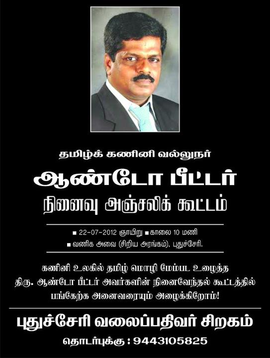 தமிழர்களிடையே தமிழ்க் கணினி குறித்து விழிப்புணர்வு செய்ய பல்வேறு நூல்களை எழுதியவரான ஆண்டோ பீட்டர் அவர்களுக்கு புதுச்சேரியில் நினைவேந்தல் நிகழ்ச்சி வரும் 22-07-2012 அன்று காலை 9.30 மணியளவில் வணிக அவை சிறிய அரங்கத்தில் நடைபெற உள்ளது. அனைவரும் வருக.