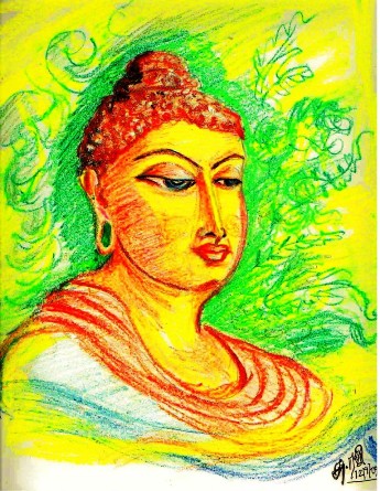 தூரிகையைவிட வண்ணப் பென்சில்கள் உபயோகித்து பிறகு நீரின் உதவியால் வாஷ் டிராயிங் செய்தது போல இருக்கிறது. புத்தரின் ஓவியத்தைக் குறிக்க மஞ்சள் வர்ணத்தை தேர்ந்தெடுத்ததும் சிறப்பு.