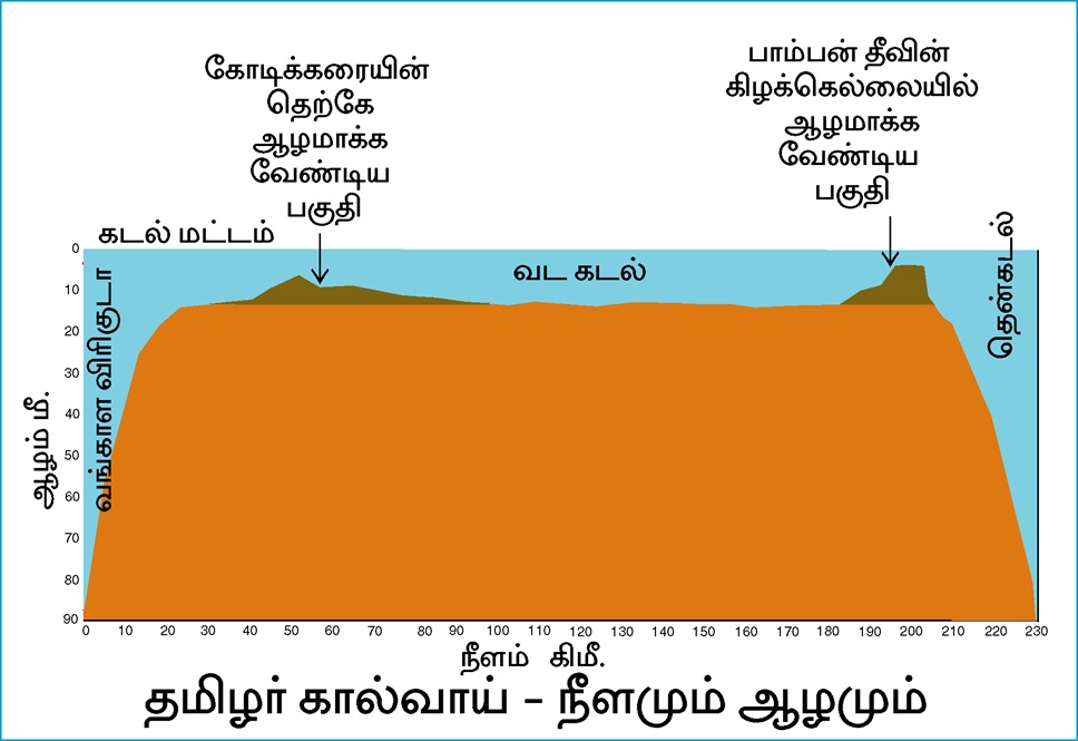 இத்திட்டத்துக்கு அமைய கோடிக்கரைக்கும் காங்கேயன் துறைக்கும் இடையே 55 கிமீ. நீளத்துக்கு 300 மீ. அகலத்தில் கடல் தரையை 12 மீ. ஆழமாக்கினால், 3 இலட்சம் மீனவர்களின் மீன்பிடிப் பரப்பெல்லை இன்றைய 5,000 சகிமீ. இலிருந்து, நாளையே 16 இலட்சம் சகிமீ. பரப்பளவாக விரியும்.