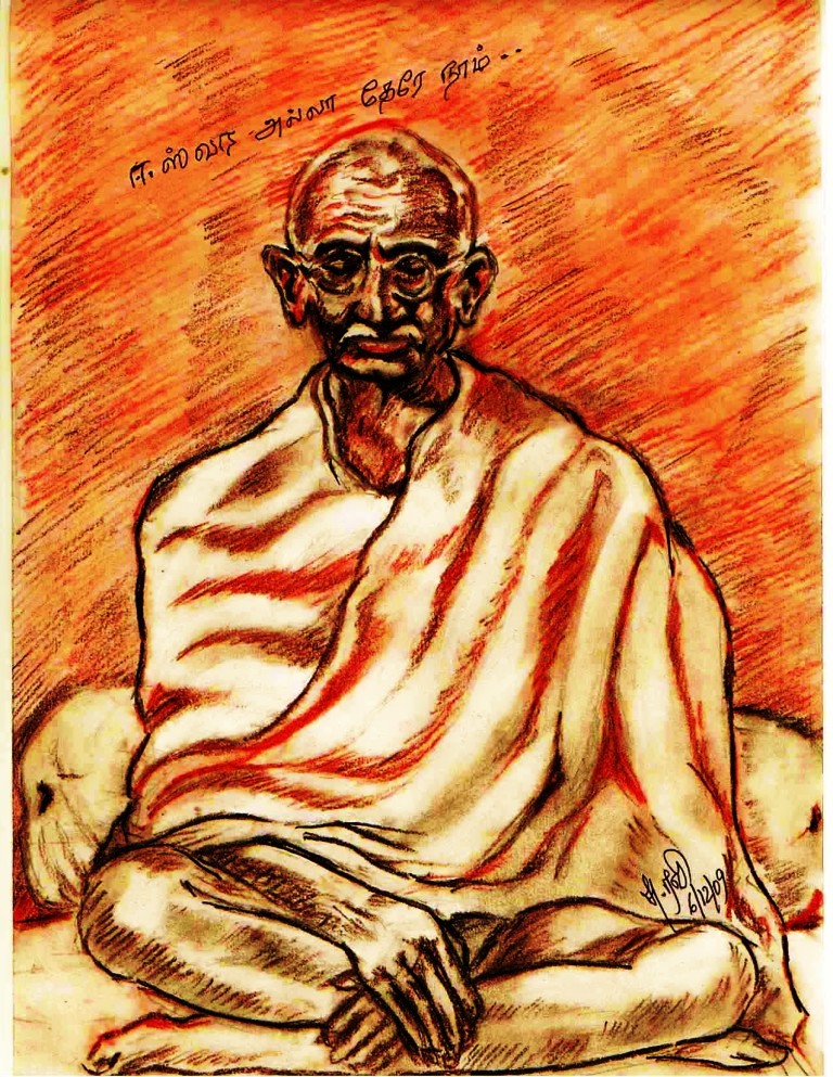 தியானநிலையில் அமர்ந்திருக்கும் காந்திஜியின் இந்த ஓவியத்தை வரைந்ததும், மேலே அவருக்குப் பிடித்தமான “ரகுபதி ராகவ ராஜாராம்” பாடல் வரிகளை எழுதும் போது என்னை அறியாமல் ஏனோ அப்பாடலின் இரண்டாம் வரியான் “ஈஸ்வர அல்லா தேரே நாம்” என்ற வரிகளை எழுதிக் கையொப்ப்ம் இட்டு வரைந்த தேதியைப் பதிவு செய்தேன்..
