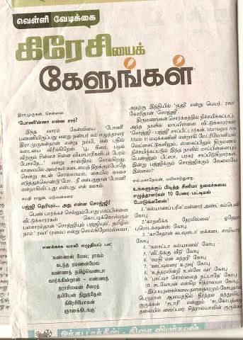 கிரேசி மொழிகள் திருமால் திருப்புகழ் ’ஹிண்டு தமிழ்’’ ‘’கிரேசியைக் கேளுங்கள்’’…. 5 கிரேசி மோகன் November 22, 2014 0 கிரேசி மோகன் பதிவாசிரியரைப் பற்றி கிரேசி மோகன் எழுத்தாளர், நடிகர், கவிஞர், என சகல கலைகளிலும் பிரபலமானவர். See author's posts Post navigation Previous: ஏன் இப்படி?Next: ஹிண்டு தமிழ்….கிரேசியைக் கேளுங்கள்….6வது வாரம் More Stories கவிதைகள் கிரேசி மொழிகள் திருமால் திருப்புகழ் மரபுக் கவிதைகள் வல்லமையும் கிரேஸியும் விவேக்பாரதி June 12, 2019 0 திருமால் திருப்புகழ் கேசவ் வண்ணம் – கிரேசி எண்ணம் கிரேசி மோகன் December 5, 2018 0 திருமால் திருப்புகழ் கேசவ் வண்ணம் – கிரேசி எண்ணம் கிரேசி மோகன் December 4, 2018 0 Leave a ReplyYour email address will not be published. Required fields are marked *Comment * Name * Email * Website Save my name, email, and website in this browser for the next time I comment. The reCAPTCHA verification period has expired. Please reload the page. Δ