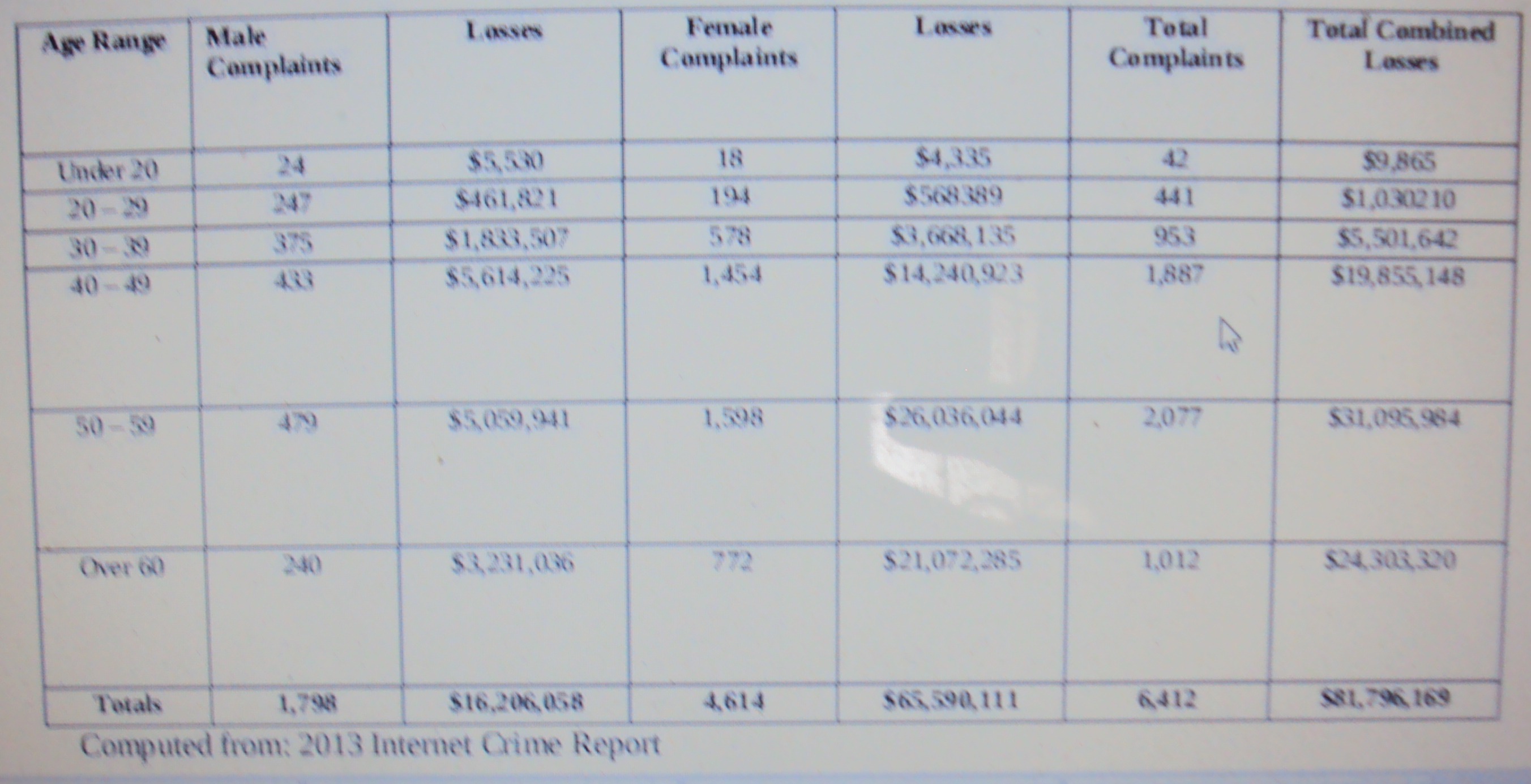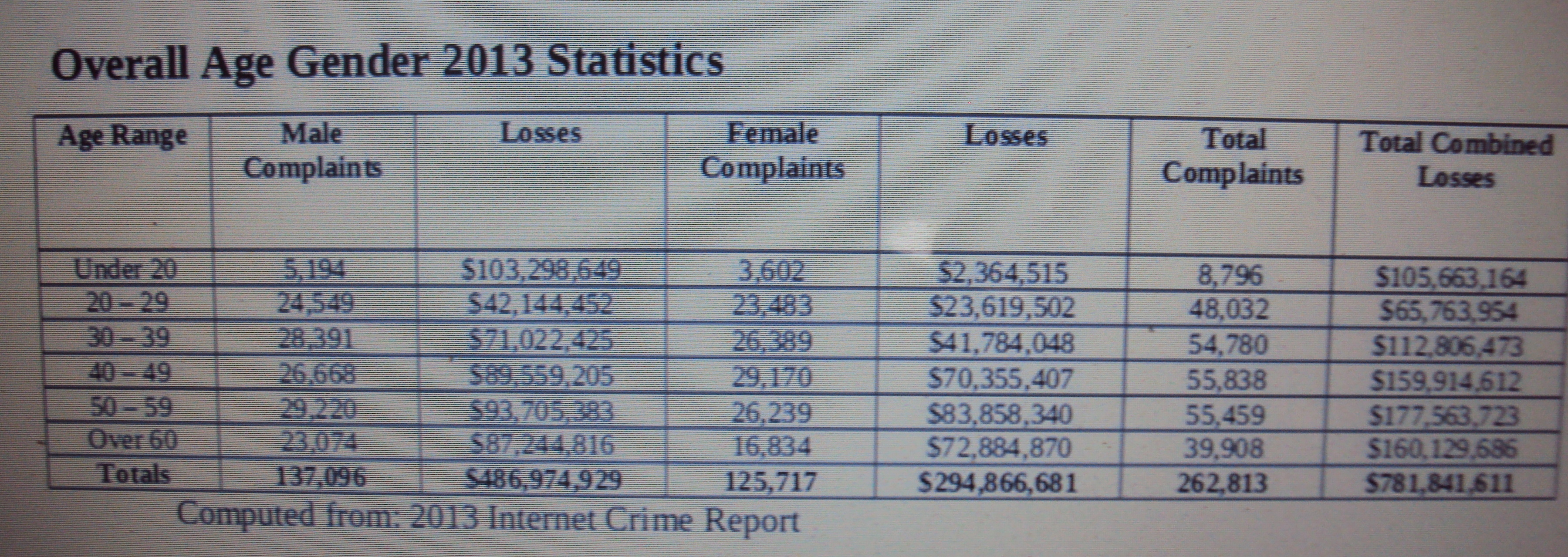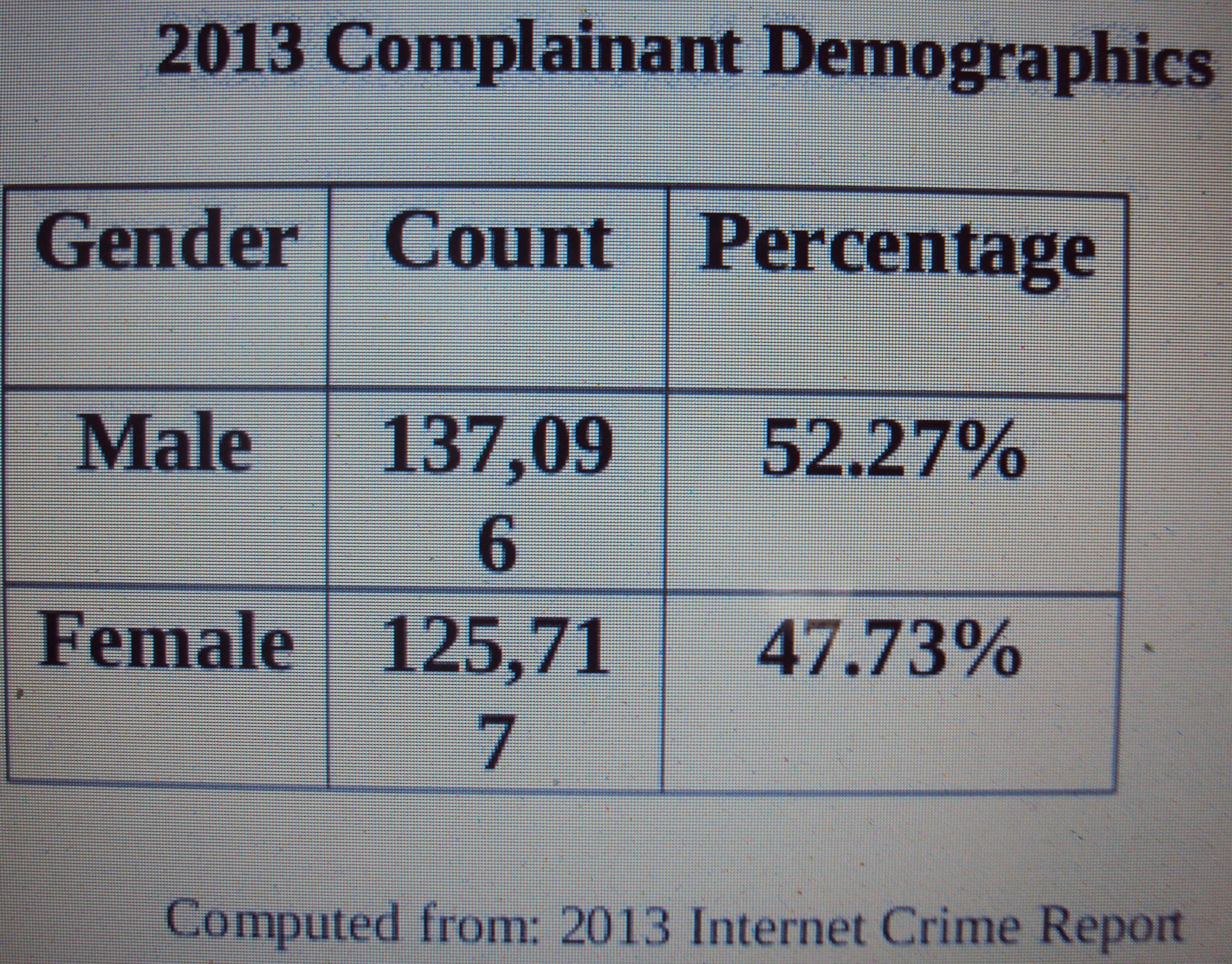 According to the Internet Crime Complaint Center (IC3) says that they have received 262,813 Complaints Reported in the year 2013. Which comprises of 45.5 percent (119,457 complaints) reported with huge financial losses. In 2013, therewas a increase in complaints reported by men compared to the complaints reported by women in 2012.