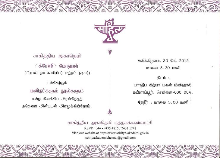 கிரேசி மொழிகள் திருமால் திருப்புகழ் சாஹித்ய அகாடமி கிரேசி மோகன் May 20, 2015 0 கிரேசி மோகன் பதிவாசிரியரைப் பற்றி கிரேசி மோகன் எழுத்தாளர், நடிகர், கவிஞர், என சகல கலைகளிலும் பிரபலமானவர். See author's posts Post navigation Previous: பழமொழி கூறும் பாடம்Next: கேசவ் வண்ணம் – கிரேசி எண்ணம் More Stories கவிதைகள் கிரேசி மொழிகள் திருமால் திருப்புகழ் மரபுக் கவிதைகள் வல்லமையும் கிரேஸியும் விவேக்பாரதி June 12, 2019 0 திருமால் திருப்புகழ் கேசவ் வண்ணம் – கிரேசி எண்ணம் கிரேசி மோகன் December 5, 2018 0 திருமால் திருப்புகழ் கேசவ் வண்ணம் – கிரேசி எண்ணம் கிரேசி மோகன் December 4, 2018 0 Leave a ReplyYour email address will not be published. Required fields are marked *Comment * Name * Email * Website Save my name, email, and website in this browser for the next time I comment. The reCAPTCHA verification period has expired. Please reload the page. Δ
