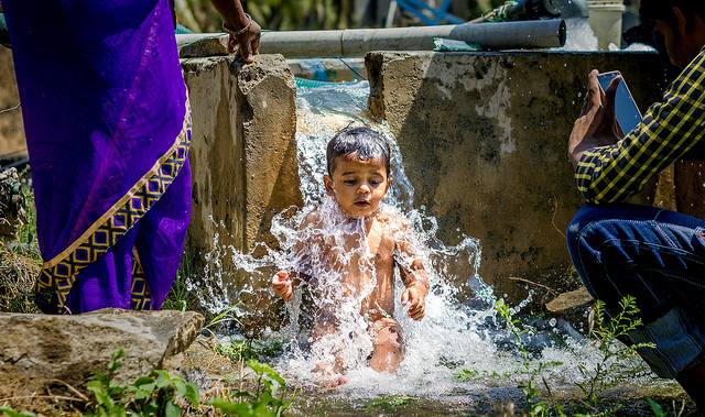 கொட்டிடும் நீரில் குதித்து விளையாடும்