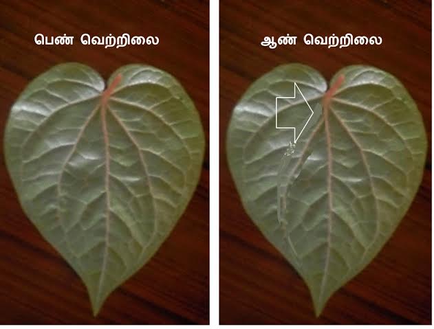 அது மட்டுமல்ல வெற்றிலையின் அமைப்பில் கிளை நரம்புகள் வெற்றிலையின் இருபக்கத்திலும் சமமாகப் பரவி நடு நரம்போடு வந்து இணையும் வடிவத்தை வைத்துக்கொண்டே அந்த வெற்றிலை ஆண் வெற்றிலையா ,அல்லது பெண் வெற்றிலையா என்று கண்டறியும் அறிஞர்கள் நம்மிடையே உண்டு