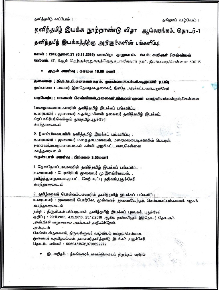 தனித்தமிழ் இயக்கத்திற்கு அறிஞர்களின் பங்களிப்பு என்னும் தலைப்பில் தனித்தமிழ் இயக்க நூற்றாண்டு விழா ஆய்வரங்கம் சென்னை, நீலாங்கரையில் 06.11.2016 (ஞாயிறு) காலை 10 மணிமுதல் மாலை வரை நடைபெறுகின்றது.