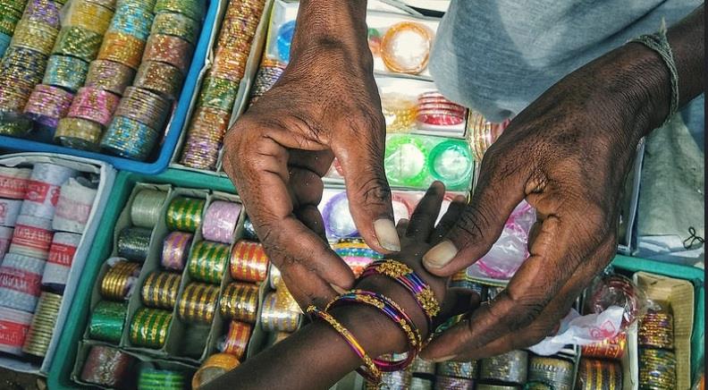 கைகளின் அளவிற்குக்கேற்ப வளையலைப் பெண்ணிற்கு அணிவித்தார்