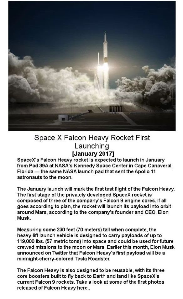 பூதகரமான பளுக்கழுகு ஏவுகணை சந்திரனுக்கும், செவ்வாய்க் கோளுக்கும் மனிதரைத் தூக்கிச் செல்லும் தகுதி ஆற்றல் உடையது. 2018 ஜனவரியில் நிகழப் போகும் சோதிப்பில் தூக்கிச் செல்லும் பளுச்சிமிழ் டெல்சா தளவூர்தி மின்சாரக் கார் [Telsa Roadster Electric car]. இந்தக் காரை டிசைன் செய்தவ நிபுணர் தென்னாப்பிரிகா அமெரிக்கர் ஏலான் முஸ்க். 2008 பிப்ரவரி முதல் 2012 டிசம்பர் வரை உலகம் முழுவதிலும் 2450 டெல்சா ரோட்ஸ்டர் மின்சாரக் கார்கள் ஓடி இயங்கி வருகின்றன. இந்த செல்வீக அண்டவெளித் திட்டம் முழுக்க முழுக்க ஏலான் முஸ்க்கின் தனிப்பட்ட செலவு. அமெரிக்க அரசாங்க உதவி எதுவும் இல்லை. உலக விண்வெளி நிபுணர்கள் ஏலான் முஸ்கின் பூத ஏவுகணை டெல்சா தளவூர்தியைத் தூக்கிச் செல்லும் வரலாற்று நாளை ஆவலுடன் எதிர்நோக்கியுள்ளார்.