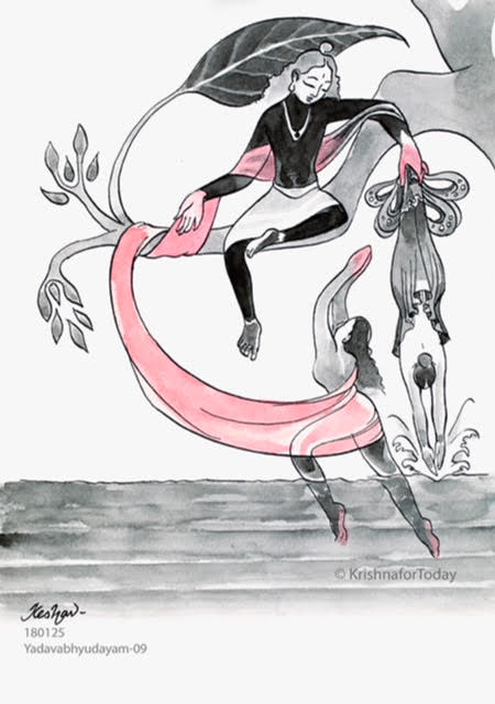 Desika:” Casting of ones vasanas, (Krishna takes away the clothes) one bathes in Krishnaanubhava, which destroys all sins. Then the gopikas appeal to get their clothes back. But he makes them to come out with folded hands, to discard their identification with the body (daehathma buddhi) — and surrender — to qualify for mukthi. Then he gives them their new cloaks, under the pretext of giving back their clothes, cleansed with the kundhamukundha sambandha. (kun dhyati, kills sins, moksha dadathi, mukundah) Until this happens, the cycle of births will continue.