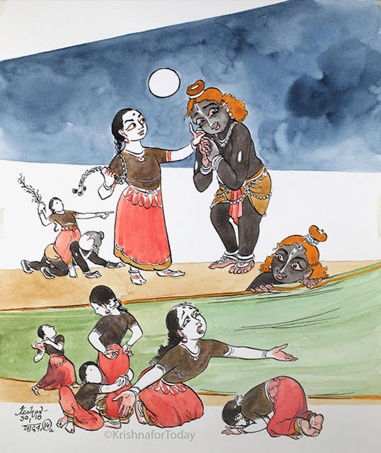 Raas 01 – Gopikas were overwhelmed with pride on their relationship with Krishna. Krishna disappears from their sight. (He was near but they couldn’t see him.) They lament their miserable plight. (Gopika geetham Sr.Bh.) They sing about the qualities of Krishna — It riverberated throughout the forest, carrying the fragrance of the upanishads. Krishna reappears — strengthening their devotion.