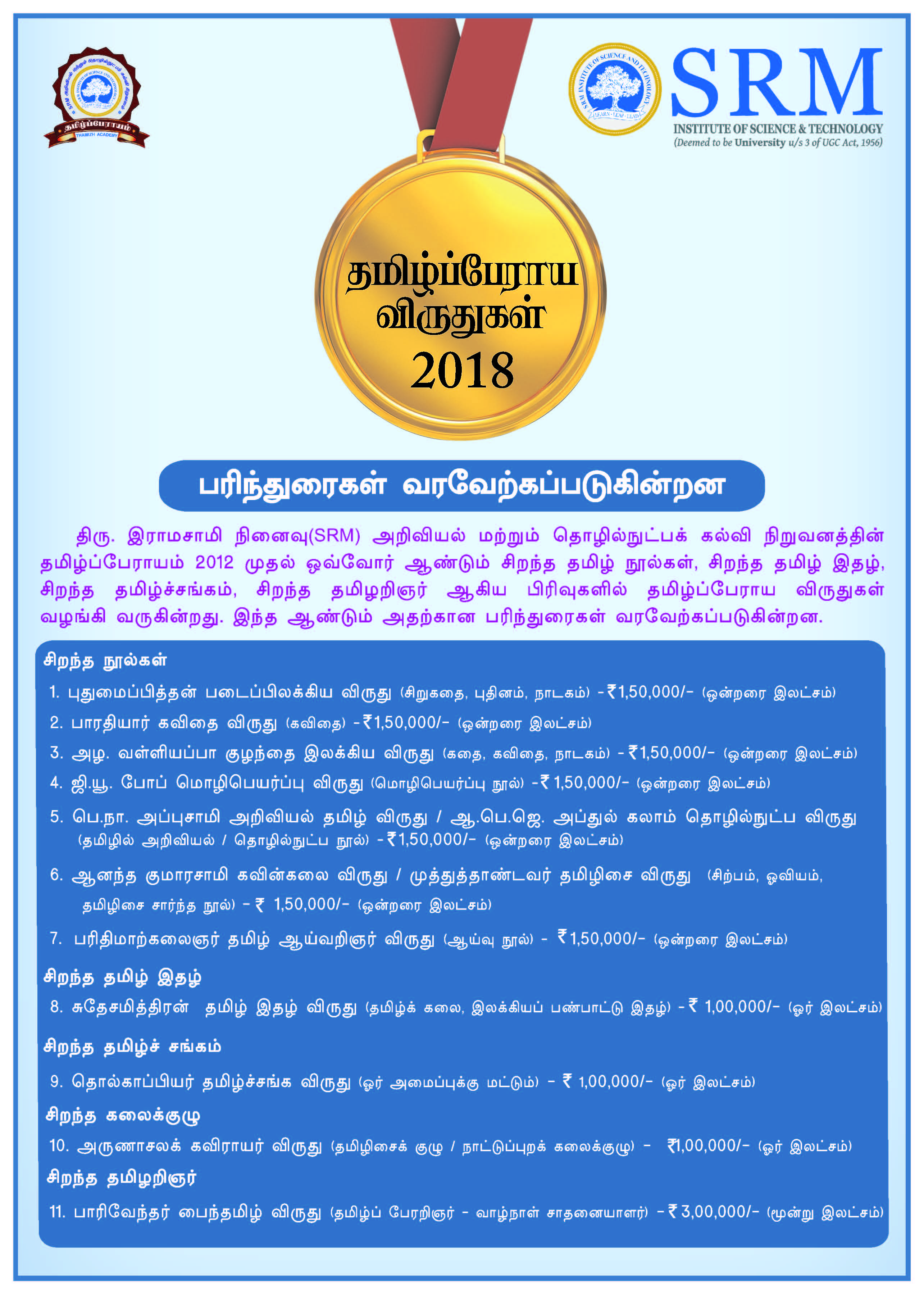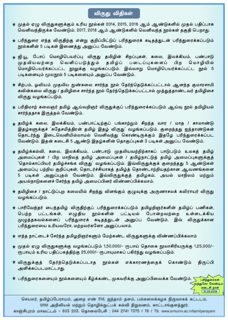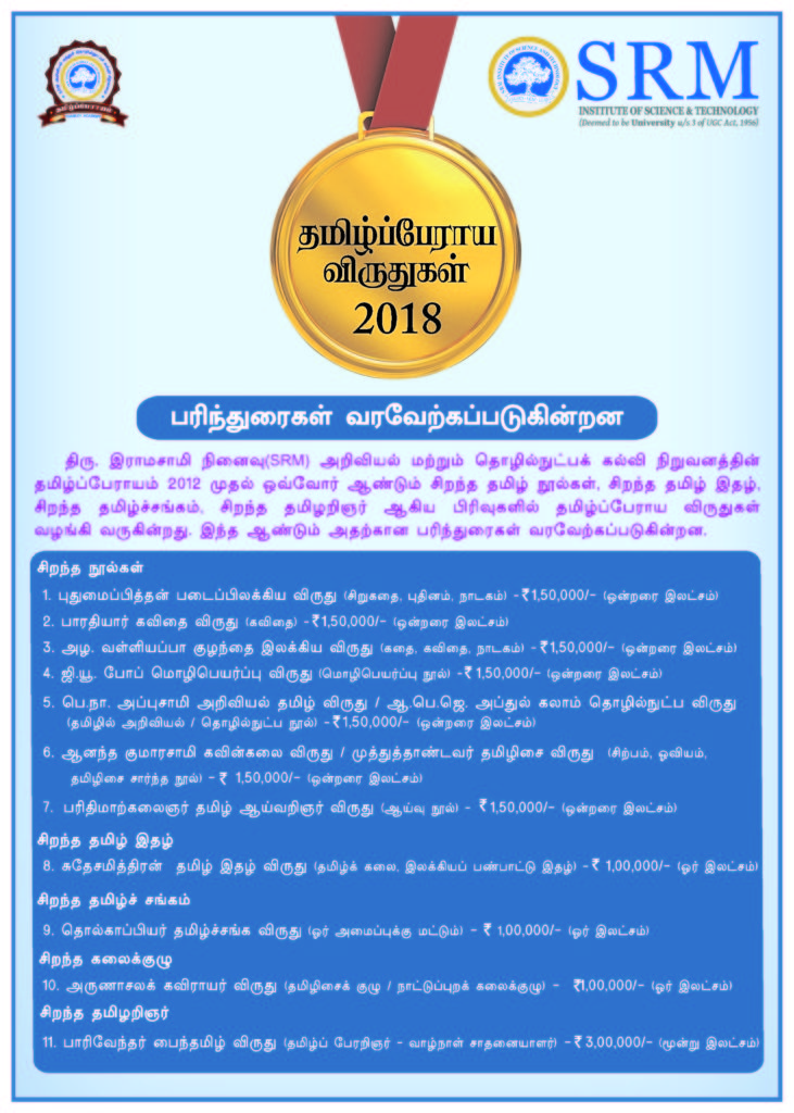 எஸ்.ஆர்.எம். பல்கலைக்கழகத் தமிழ்ப்பேராய விருதுகளுக்கு விண்ணப்பிக்கக் கால நீட்டிப்பு