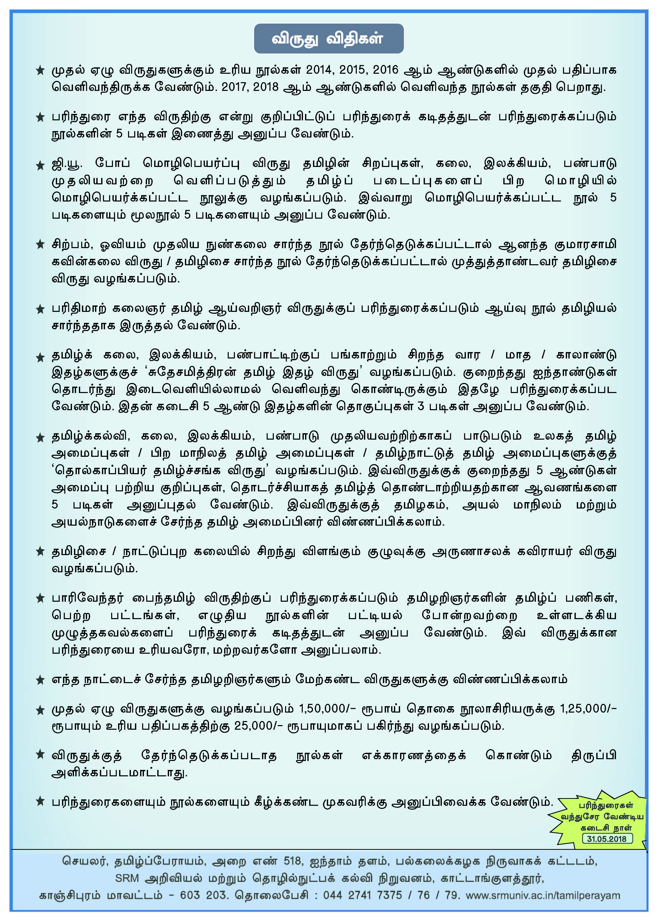 இவ் விருதுகளுக்கு விண்ணப்பிக்கக் கடைசி நாள் மே 31 என்று முன்னர் அறிவிக்கப்பட்டது. பலரது வேண்டுகோளுக்கிணங்க சூன் 15 வரை விண்ணப்பிப்பதற்கான காலம் நீட்டிப்பு செய்யப்பட்டிருக்கிறது. எனவே, தகுதியுடையவர்கள் செயலர், தமிழ்ப்பேராயம், எண் 518, ஐந்தாம் தளம், பல்கலைக்கழக நிருவாகக் கட்டடம், எஸ்.ஆர்.எம். அறிவியல் மற்றும் தொழில் நுட்பக் கழக நிறுவனம், காட்டாங்குளத்தூர் – 603 203 என்ற முகவரிக்குத் தங்கள் படைப்புகளை அனுப்புமாறு கேட்டுக்கொள்ளப்படுகிறார்கள். மேலும் விவரங்களுக்கு 044 2741 7379 – ல் தொடர்புகொள்ளவும்.