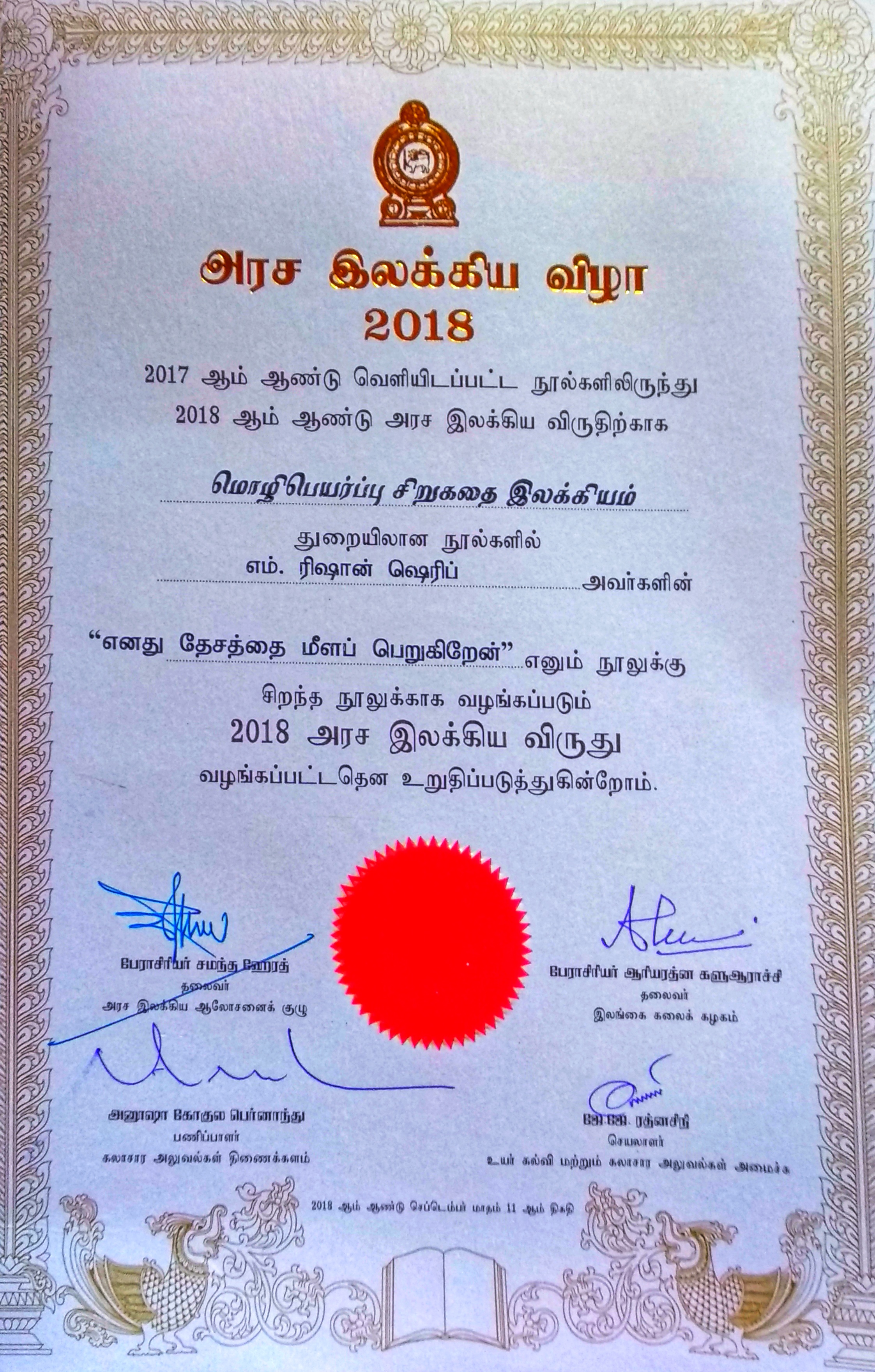 இந்த விழாவில் இலங்கை ஊடகவியலாளர் மற்றும் எழுத்தாளர் எம்.ரிஷான் ஷெரீபின் ‘எனது தேசத்தை மீளப் பெறுகிறேன்’ எனும் நூலுக்கு ‘சிறந்த மொழிபெயர்ப்பு சிறுகதை இலக்கியத்துக்கான அரச சாகித்திய இலக்கிய விருது’ வழங்கப்பட்டு கௌரவிக்கப்பட்டுள்ளது. இந் நிகழ்வில் தமிழ், சிங்களம், ஆங்கிலம் ஆகிய மொழிகளில் 2017 ஆம் ஆண்டு வெளிவந்த 2300 நூல்கள் பரிசீலிக்கப்பட்டு, அவற்றுள் சிறந்த நூல்களுக்கு விருதுகள் வழங்கப்பட்டுள்ளமை குறிப்பிடத்தக்கது.